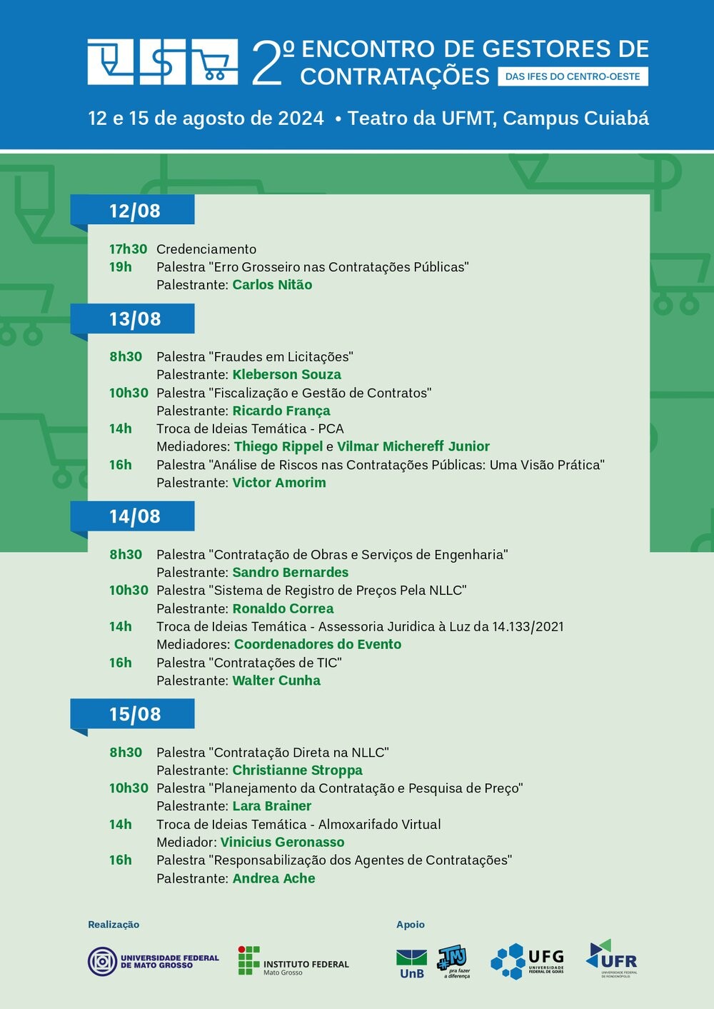 A organização do 2º Encontro ficou a cargo da Coordenadoção de Gestão de Contratações da UFMT e Diretoria de Administração do IFMT, com o apoio das Diretorias de Compras da UFG e UnB e também da Diretoria de Compras, Licitação e Contratos da Universidade Federal de Rondonópolis (UFR).